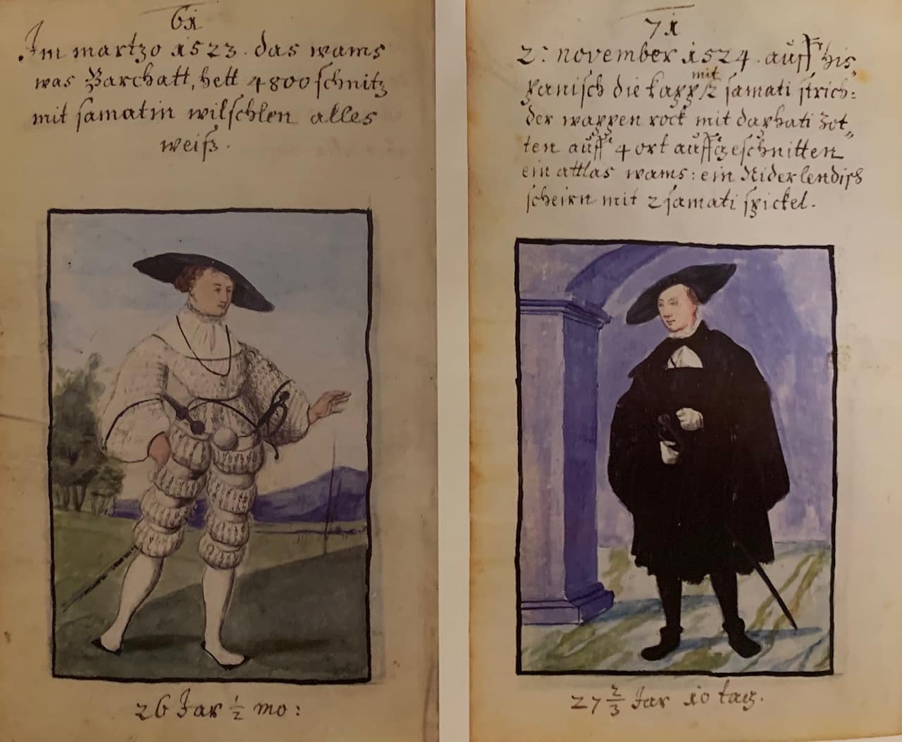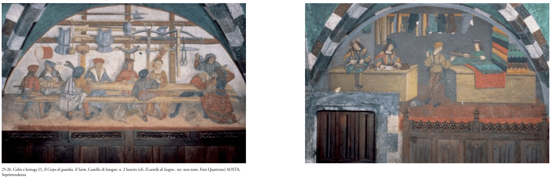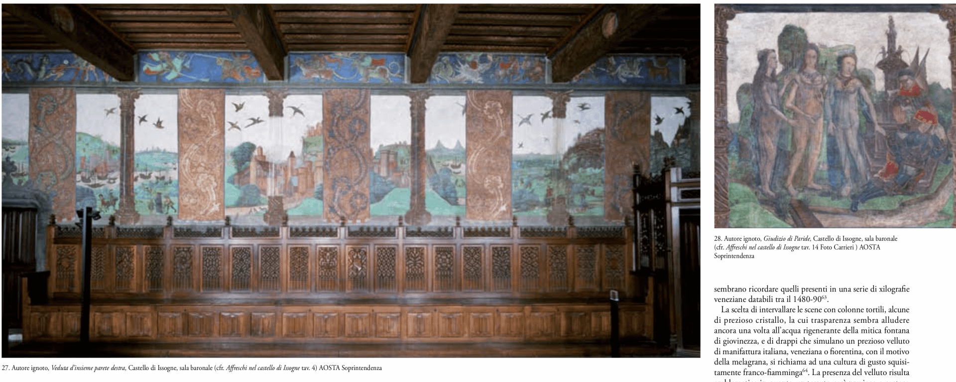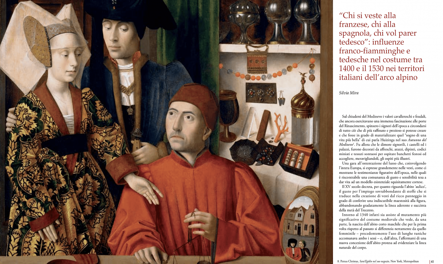 “Chi si veste alla franzese, chi alla spagnola, chi vol parer tedesco”: influenze franco-fiamminghe e tedesche nel costume tra 1400 e il 1530 nei territori italiani dell’arco alpino Silvia Mira Sul chiudersi del Medioevo i valori cavallereschi e feudali, che ancora esercitavano una immensa fascinazione alle porte del Rinascimento, spinsero i signori dell’epoca a circondarsi di tutto ciò che di più raffinato e prezioso si potesse creare e che fosse in grado di materializzare quel “sogno di una vita più bella” di cui parla Huizinga nel suo Autunno del Medioevo1. Fu allora che le dimore signorili, i castelli ed i palazzi, furono decorati da affreschi, arazzi, dipinti, codici miniati e tessuti sontuosi per ospitare banchetti festosi ed accogliere, meravigliandoli, gli ospiti più illustri. Una gara all’ostentazione del lusso che, coinvolgendo l’intera Europa, si espresse grandemente nelle vesti, come ci mostrano le testimonianze figurative dell’epoca, nelle quali è riscontrabile una comunanza di gusto e sensibilità tesa a dar vita ad un modello esistenziale squisitamente cortese. Il XV secolo decreta, per quanto riguarda l’abito ‘aulico’, il gusto per l’impiego sovrabbondante di stoffe che si traduce nella creazione di vesti dal ricco panneggio in grado di conferire una indiscutibile maestosità alla figura, abbandonando gradatamente la linea aderente e succinta della metà del Trecento. Intorno al 1340 infatti sia assiste al mutamento più significativo del costume medievale che vede, da una parte, la nascita dell’abito corto maschile che per la prima volta rispetto al passato si differenzia nettamente da quello femminile – precedentemente l’uso di lunghe tuniche accomunava ambo i sessi – e, dall’altra, l’affermarsi di una nuova concezione dell’abito protesa ad evidenziare la linea naturale del corpo.