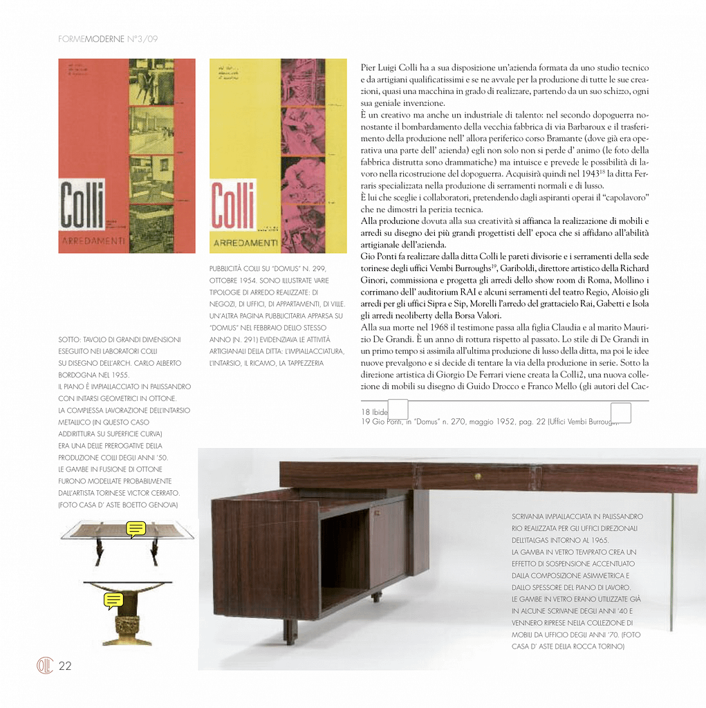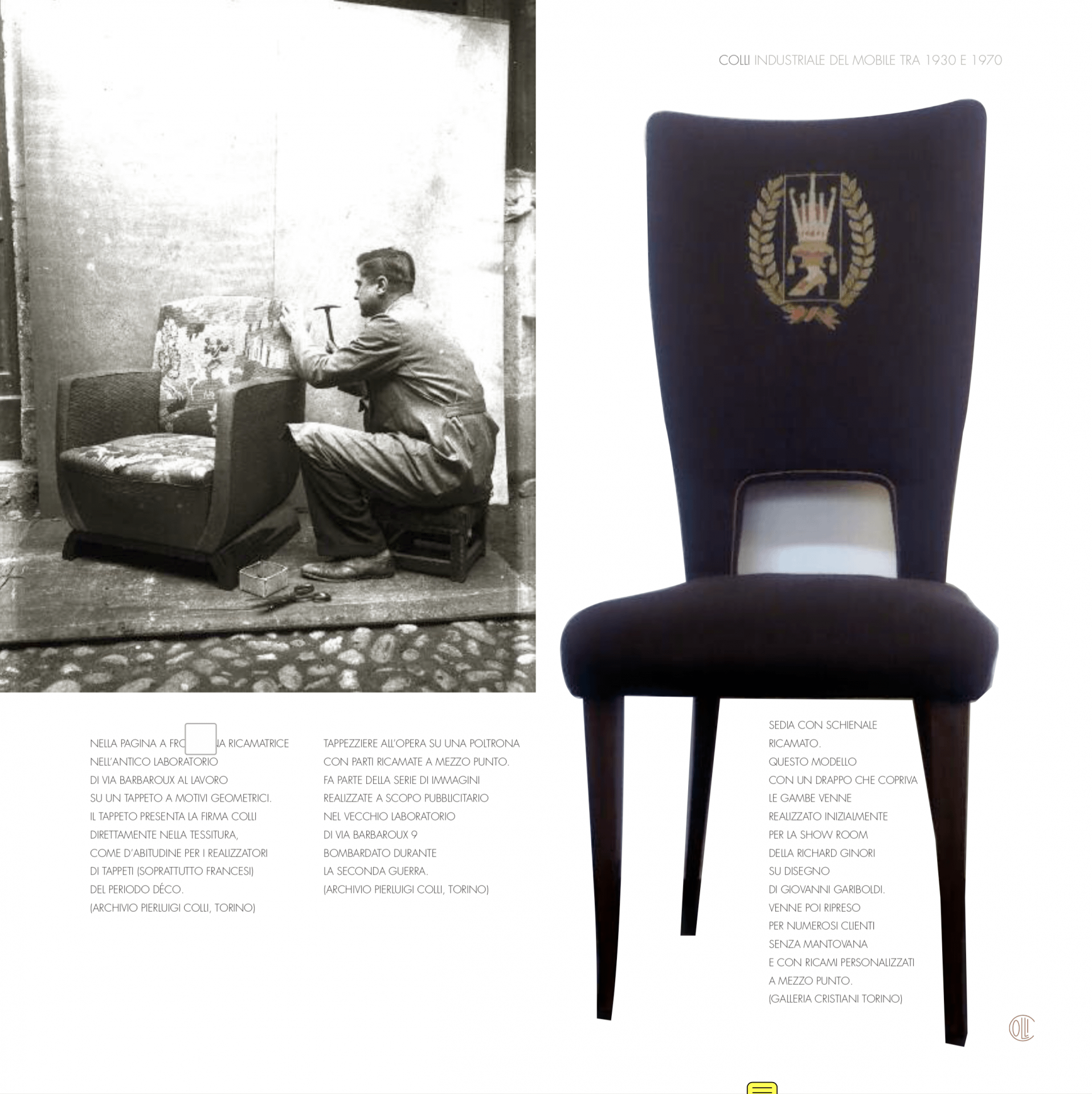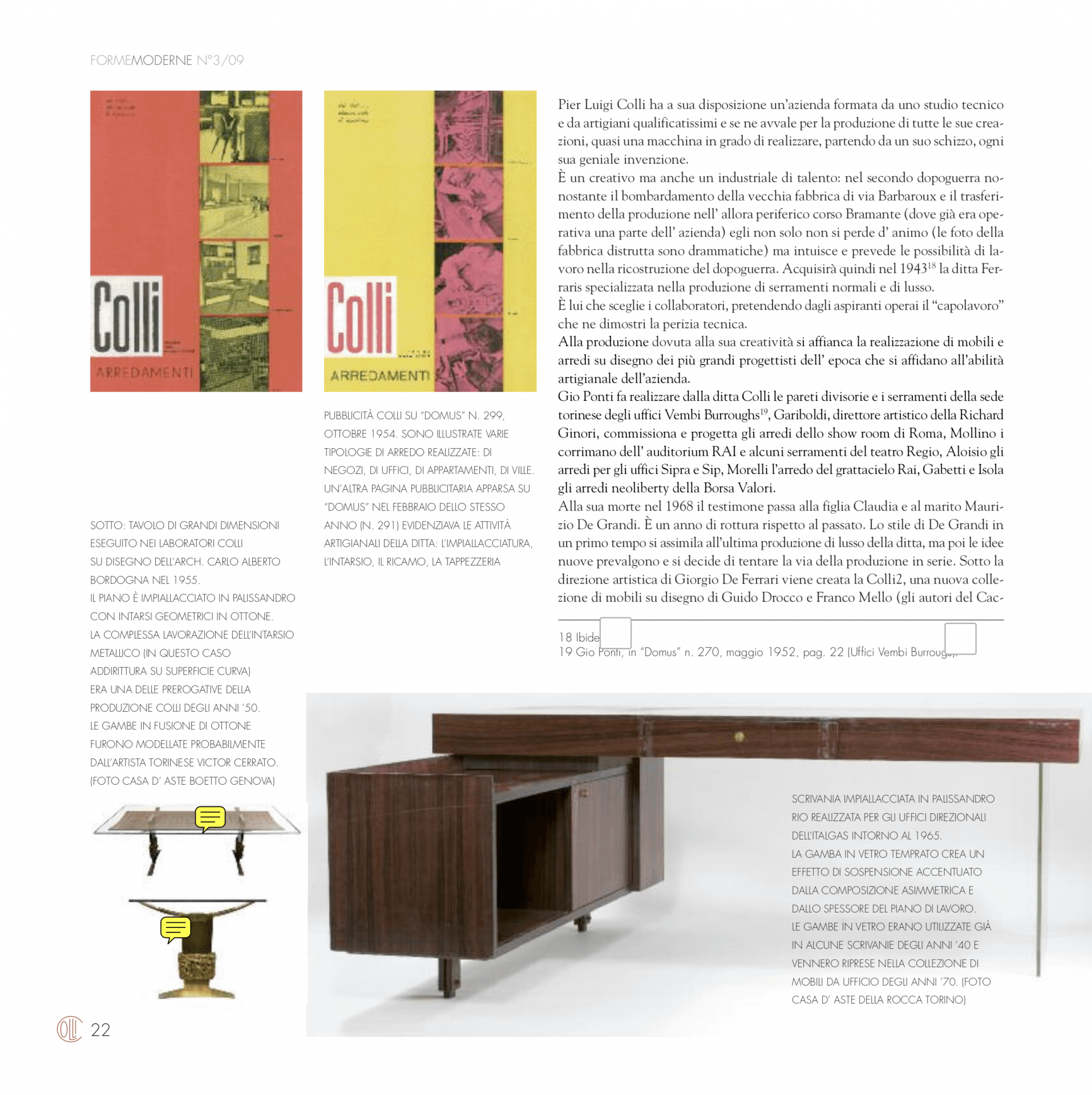 Perfino dopo la seconda guerra mondiale, quando si entra in un’era in cui si produce in gran serie, in cui i titolari delle industrie mobiliere si affidano ad architetti e designer per creare i prototipi dei loro mobili moderni, Colli, industriale sui generis, pur adeguandosi all’evoluzione del gusto, vanta ancora una produzione personalizzata e continua, per lo meno per tutti gli anni Cinquanta, a disegnare egli stesso la maggior parte dei modelli che produce.
