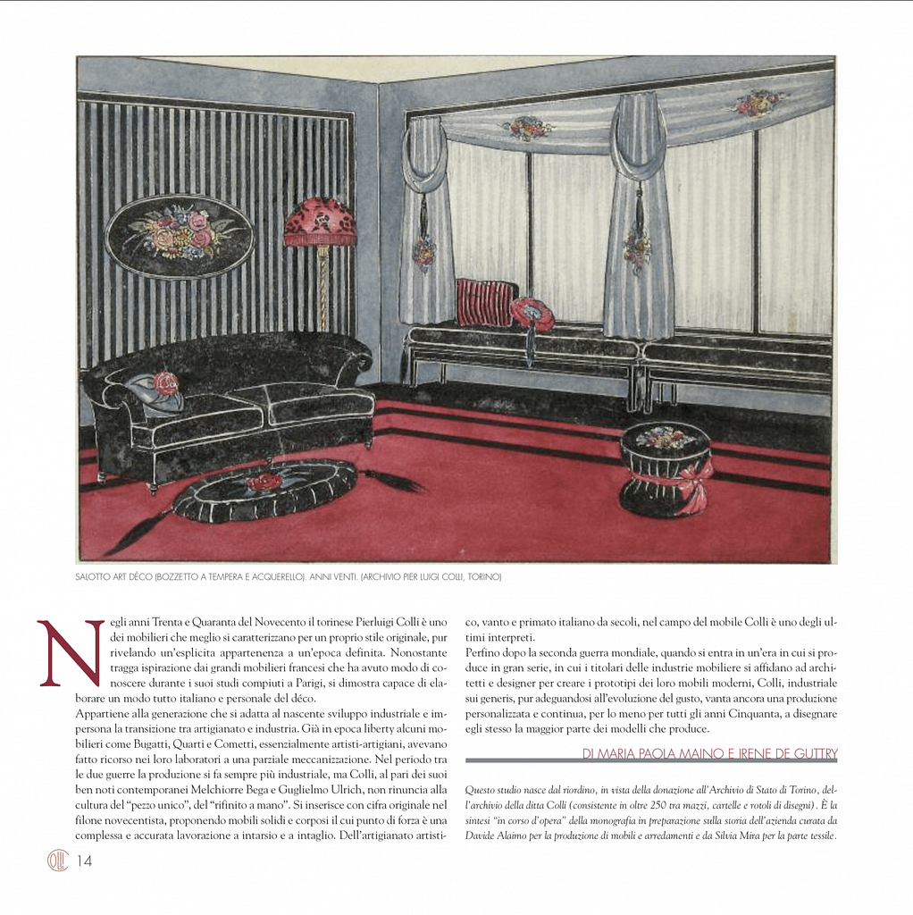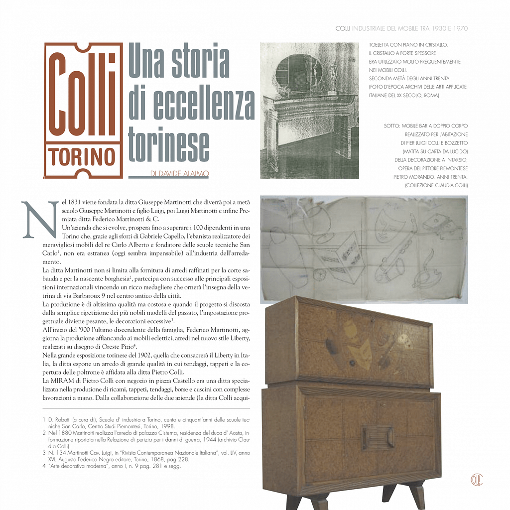 Negli anni Trenta e Quaranta del Novecento il torinese Pierluigi Colli è uno dei mobilieri che meglio si caratterizzano per un proprio stile originale, pur rivelando un’esplicita appartenenza a un’epoca definita. Nonostante tragga ispirazione dai grandi mobilieri francesi che ha avuto modo di conoscere durante i suoi studi compiuti a Parigi, si dimostra capace di elaborare un modo tutto italiano e personale del déco.