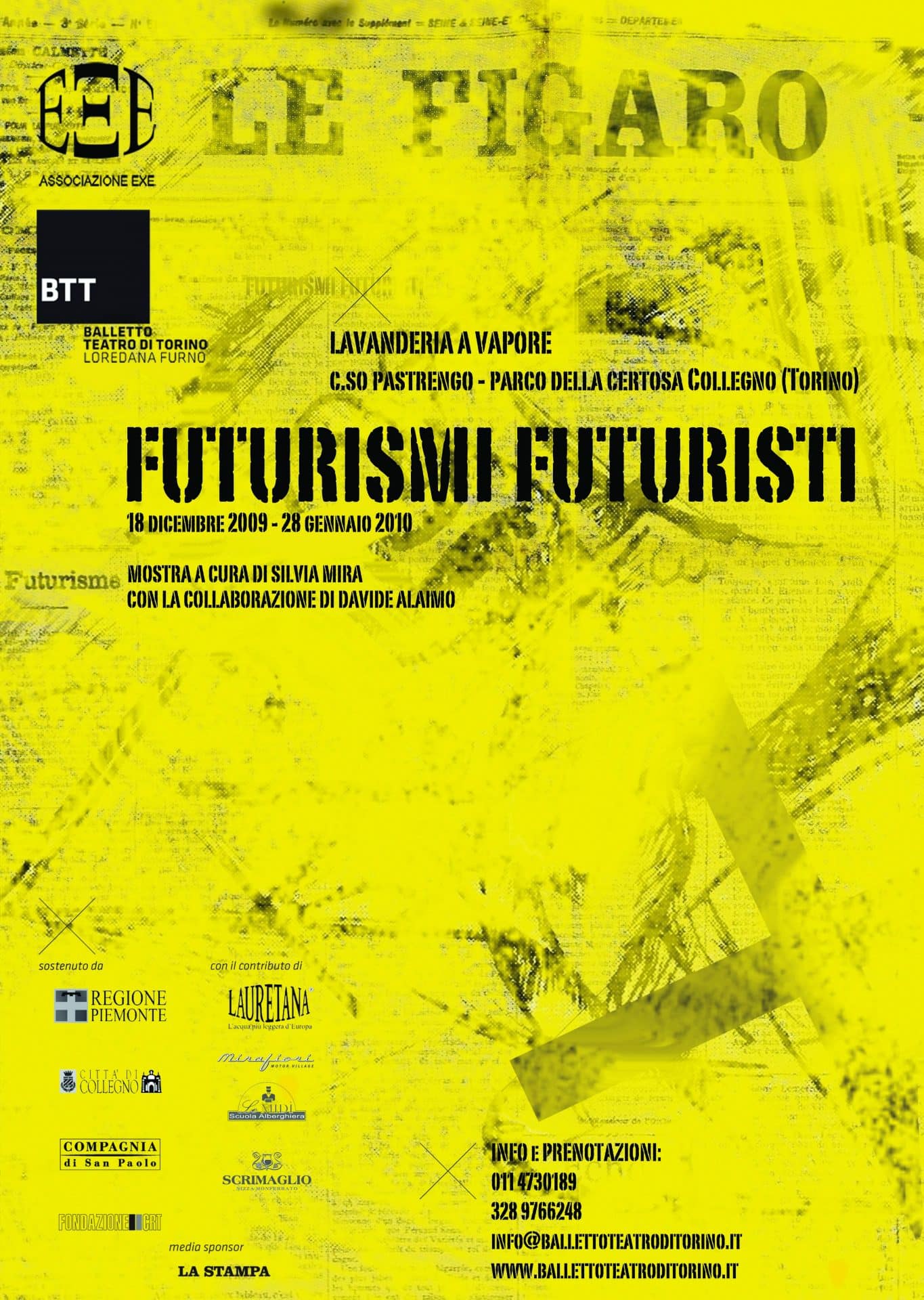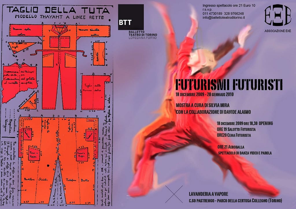 Il Balletto Teatro di Torino (BTT), in occasione del centenario del Futurismo, presenta, dal 18 dicembre 2009 al 28 gennaio 2010 presso la Lavanderia a vapore di Collegno, Futurismi Futuristi, esposizione a cura di Silvia Mira, con la collaborazione di Davide Alaimo. Nella mostra, accanto ai manifesti futuristi (messi a disposizione da Francesca Barbi, nipote del fondatore del movimento), e alle installazioni multimediali degli artisti del Net.Futurismo, verranno esposte le ceramiche disegnate da Tullio Mazzotti (omaggio al centenario futurista, della manifattura “Ceramiche Giuseppe Mazzotti 1903 Albisola”), i mobili di Pagano per gli uffici di Riccardo Gualino, rivestiti in buxus, materiale prediletto da Depero e, da ultimo, i paraventi e le piante disegnate da Balla, tuttora riproposte dalla Ditta Simon. Una sezione dell’esposizione sarà dedicata interamente alla moda: in mostra alcuni abiti della collezione Balmoda di Laura Biagiotti, creati dalla stilista nel 1996 per l’importante mostra tenutasi al Museo Puskin di Mosca, la borsa “Balla”, ricostruzione fedele di Borbonese dai disegni dell’artista e alcune T-shirt, felpe e controcravatte del marchio Sivoga, ispirate al manifesto della controcravatta net.futurista. Il 18 dicembre, alle ore 19, il pubblico è invitato al Salotto Futurista, con Francesca Barbi, studiosa e nipote di Filippo Tommaso Marinetti, Alessandro Pontremoli, docente di storia della danza e del mito presso il Dams di Torino. Subito dopo, alle ore 21, sarà messo in scena Areoballa, spettacolo di danza, video e parola che, ripercorrendo i temi principali del manifesto futurista, ripropone i momenti più rappresentativi della “ricostruzione futurista dell’universo” Silvia Mira.
