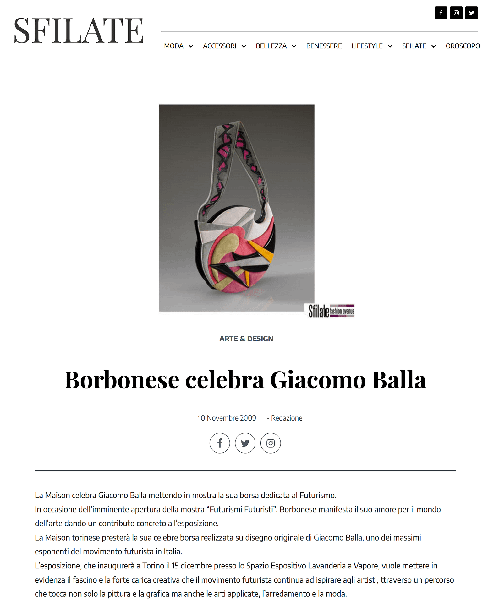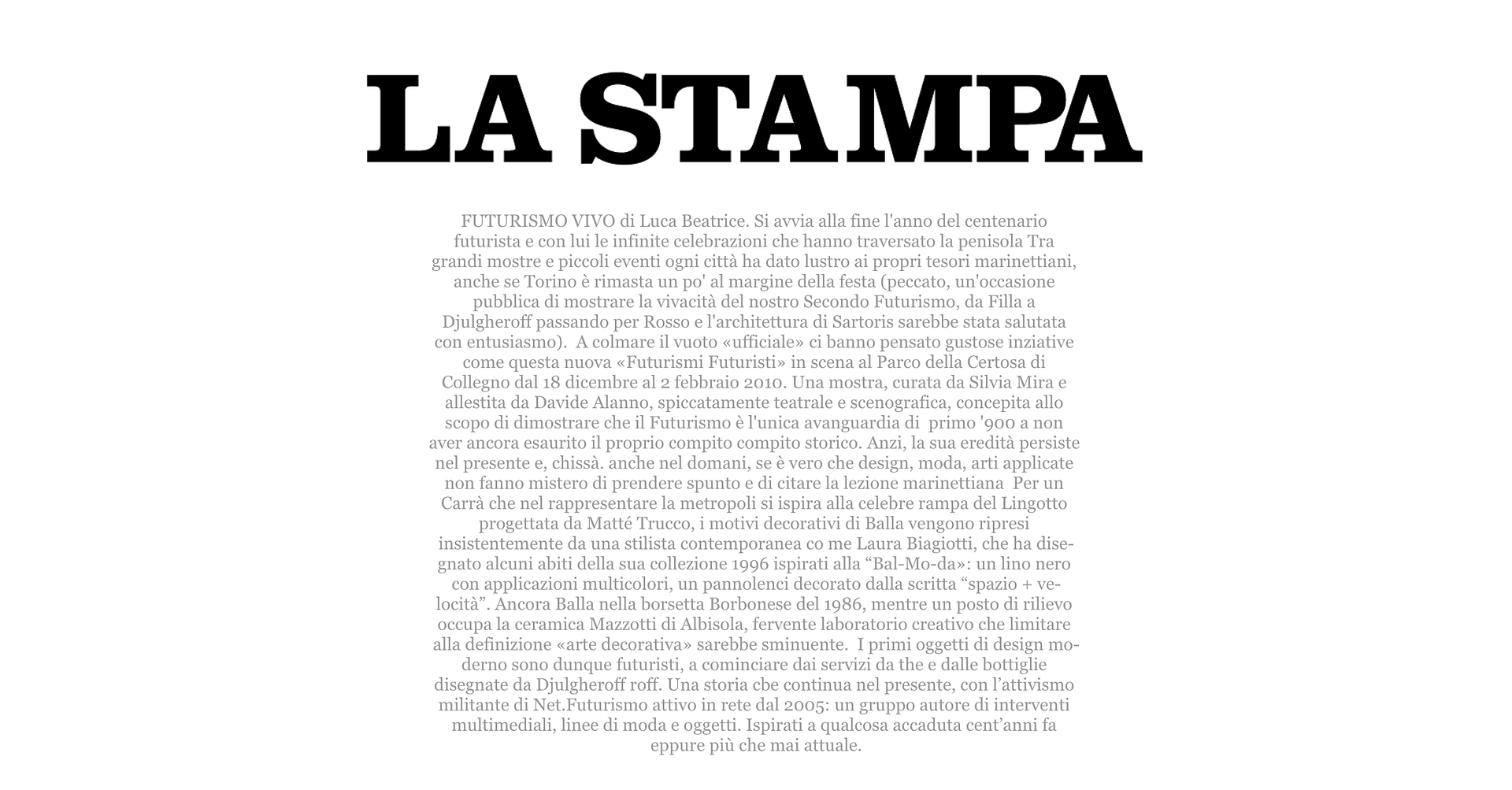 LA STAMPA 18/12/2009 LUCA BEATRICE. Si avvia alla fine l'anno del centenario futurista e con lui le infinite celebrazioni che hanno traversato la penisola Tra grandi mostre e piccoli eventi ogni città ha dato lustro ai propri tesori marinettiani, anche se Torino è rimasta un po' al margine della festa (peccato, un'occasione pubblica di mostrare la vivacità del nostro Secondo Futurismo, da Filla a Djulgheroff passando per Rosso e l'architettura di Sartoris sarebbe stata salutata con entusiasmo). A colmare il vuoto «ufficiale» ci banno pensato gustose inziative come questa nuova «Futurismi Futuristi» in scena al Parco della Certosa di Collegno dal 18 dicembre al 2 febbraio 2010. Una mostra, curata da Silvia Mira e allestita da Davide Alanno, spiccatamente teatrale e scenografica, concepita allo scopo di dimostrare che il Futurismo è l'unica avanguardia di primo '900 a non aver ancora esaurito il proprio compito compito storico. Anzi, la sua eredità persiste nel presente e, chissà. anche nel domani, se è vero che design, moda, arti applicate non fanno mistero di prendere spunto e di citare la lezione marinettiana Per un Carrà che nel rappresentare la metropoli si ispira alla celebre rampa del Lingotto progettata da Matté Trucco, i motivi decorativi di Balla vengono ripresi insistentemente da una stilista contemporanea co me Laura Biagiotti, che ha disegnato alcuni abiti della sua collezione 1996 ispirati alla “Bal-Mo-da»: un lino nero con applicazioni multicolori, un pannolenci decorato dalla scritta “spazio + velocità”. Ancora Balla nella borsetta Borbonese del 1986, mentre un posto di rilievo occupa la ceramica Mazzotti di Albisola, fervente laboratorio creativo che limitare alla definizione «arte decorativa» sarebbe sminuente. I primi oggetti di design moderno sono dunque futuristi, a cominciare dai servizi da the e dalle bottiglie disegnate da Djulgheroff roff. Una storia cbe continua nel presente, con l’attivismo militante di Net.Futurismo attivo in rete dal 2005: un gruppo autore di interventi multimediali, linee di moda e oggetti. Ispirati a qualcosa accaduta cent’anni fa eppure più che mai attuale.[/caption]