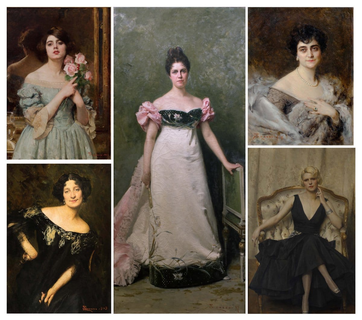 «Lidia Bass Kuster» (1903), «Luisa Chessa» (1903), «Daisy de Robilant Francesetti di Malgrà» (1897), «La Contessa Gallo» (1918), «Eleonora Guglielminetti Vigliardi Paravia» (1919), «L’ingegnere Vittorio Tedeschi» (1925) sono solo alcuni dei personaggi che con i loro volti signorili, gli sguardi profondi e i sontuosi vestiti esprimono il senso della ricerca visiva di Grosso e la straordinaria definizione degli interni, con le figure che quasi emergono dallo spazio della tela e che creano un intrigante rapporto con gli ambienti e l’arredamento del museo. In mostra, i dipinti sono affiancati da una serie di accessori, quali raffinati cappelli, ventagli di piume di struzzo, scarpe da sera in raso e guanti in camoscio, tutti provenienti dalle collezioni del Liceo Artistico Aldo Passoni di Torino e da due abiti, delle collezioni della celebre Sartoria Devalle, che occhieggiano e ricreano la suggestione delle «toilettes» delle dame ritratte dal Maestro.