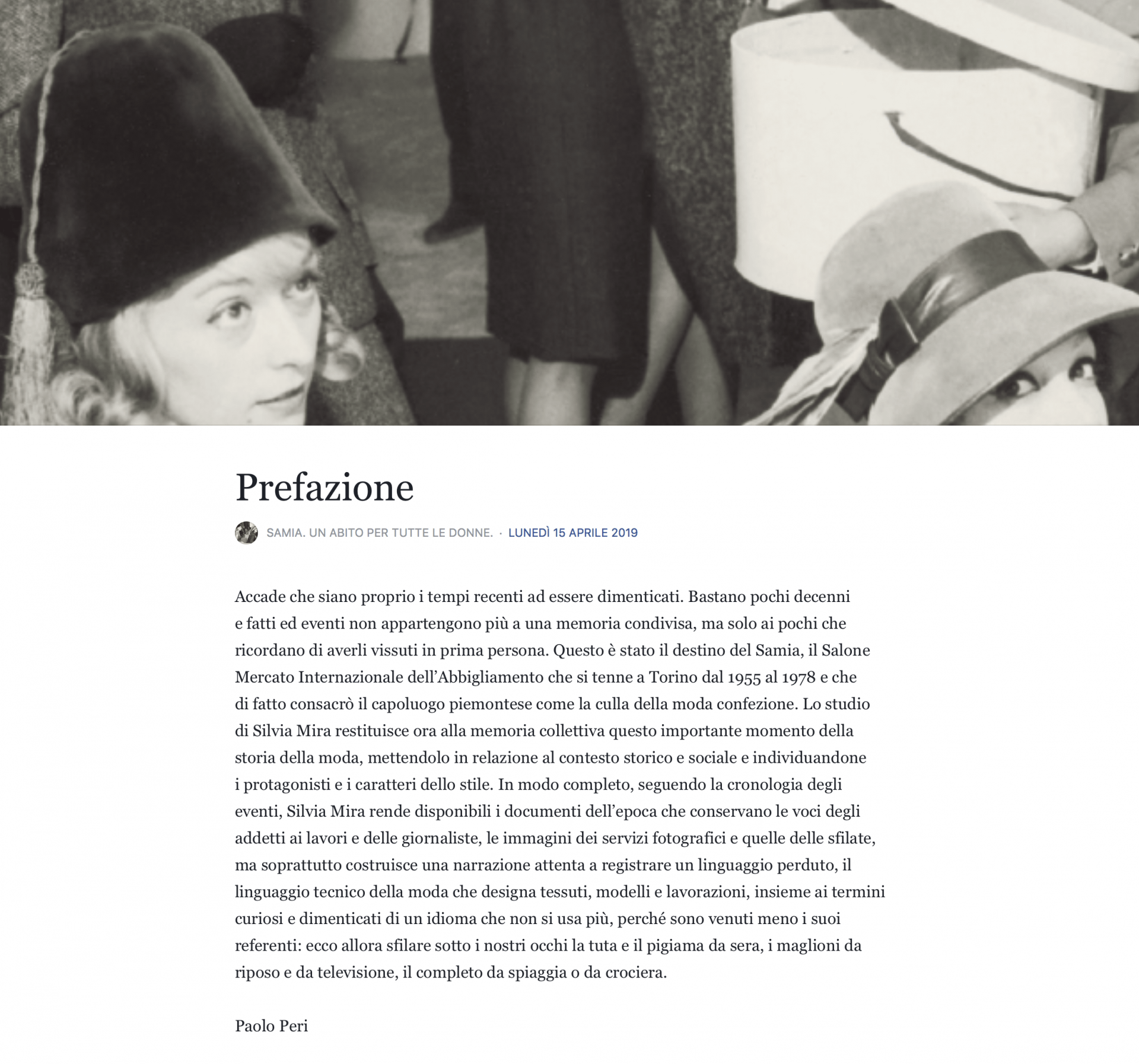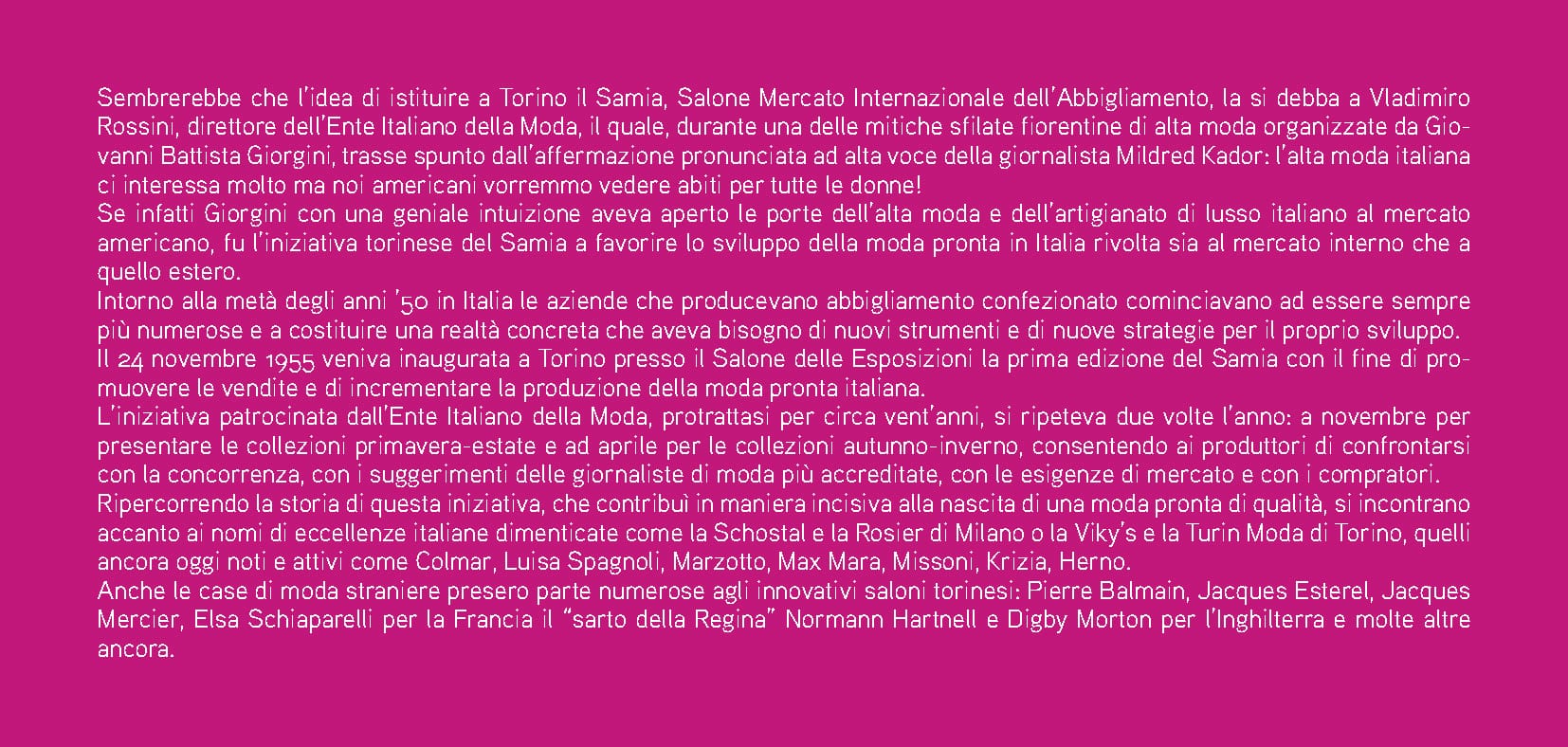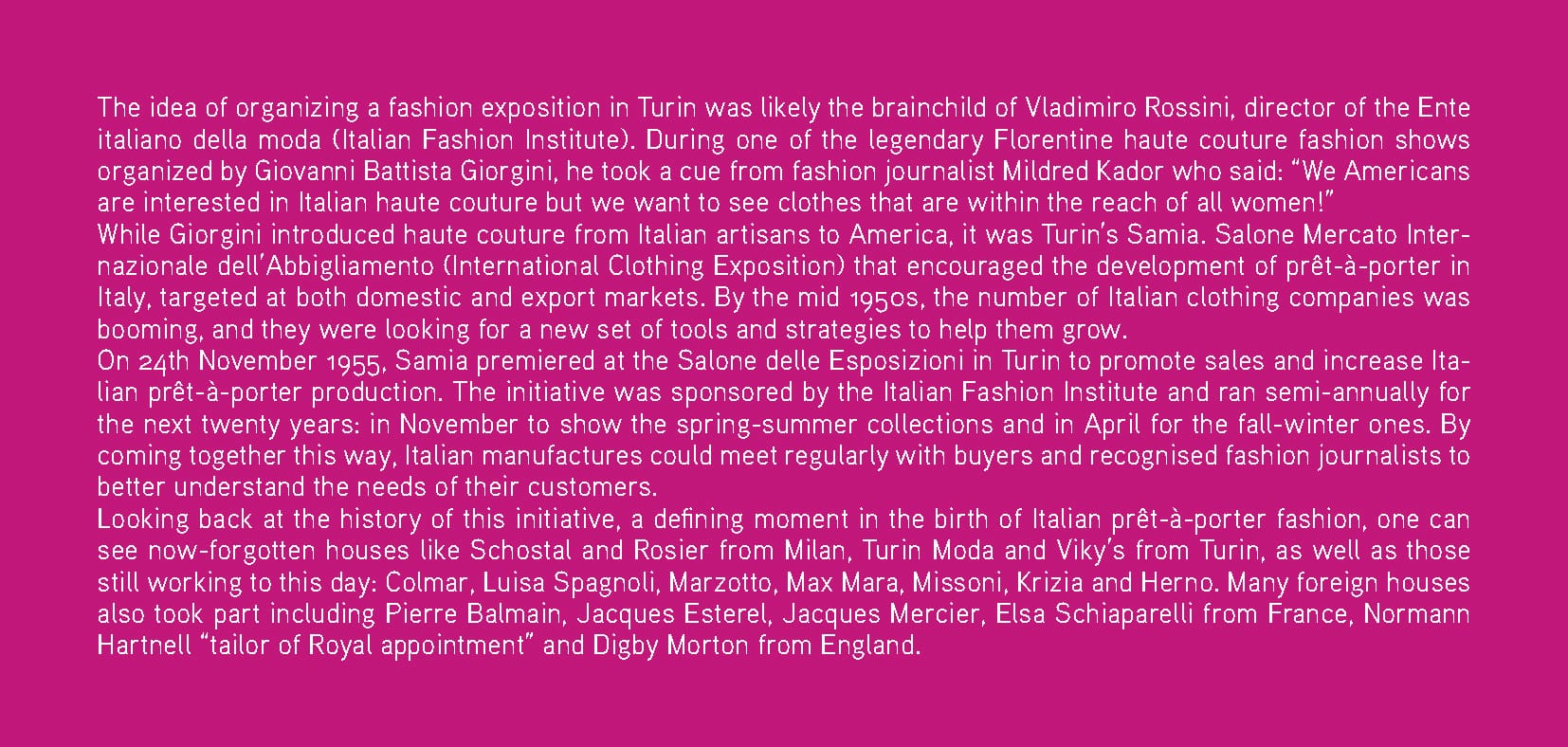 The idea of organizing a fashion exposition in Turin was likely the brainchild of Vladimiro Rossini, director of the Ente ita- liano della moda (Italian Fashion Institute). During one of the legendary Florentine haute couture fashion shows organized by Giovanni Battista Giorgini, he took a cue from fashion jour- nalist Mildred Kador who said: “We Americans are interested in Italian haute couture but we want to see clothes that are within the reach of all women!” While Giorgini introduced haute couture from Italian artisans to America, it was Turin’s Samia, Salone Mercato Internazio- nale dell’Abbigliamento (International Clothing Exposition), that encouraged the development of prêt-à-porter in Italy, targeted at both domestic and export markets. By the mid 1950s, the number of Italian clothing companies was boo- ming, and they were looking for a new set of tools and strategies to help them grow. On 24th November 1955, Samia premiered at the Salone del- le Esposizioni in Turin to promote sales and increase Italian prêt-à-porter production. The initiative was sponsored by the Italian Fashion Institute and ran semiannually for the next twenty years: in November to show the springsummer collections and in April for the fall-winter ones. By coming to- gether this way, Italian manufactures could meet regularly with buyers and recognised fashion journalists to better un- derstand the needs of their customers. Looking back at the history of this initiative, a defining moment in the birth of Italian prêt-à-porter fashion, one can see now-forgotten houses like Schostal and Rosier from Milan, Turin Moda and Viky’s from Turin, as well as those still working to this day: Colmar, Luisa Spagnoli, Marzotto, Max Mara, Missoni, Krizia and Herno. Many foreign houses also took part including Pierre Balmain, Jacques Esterel, Jacques Mer- cier, Elsa Schiaparelli from France, Normann Hartnell “tailor of Royal appointment” and Digby Morton from England.